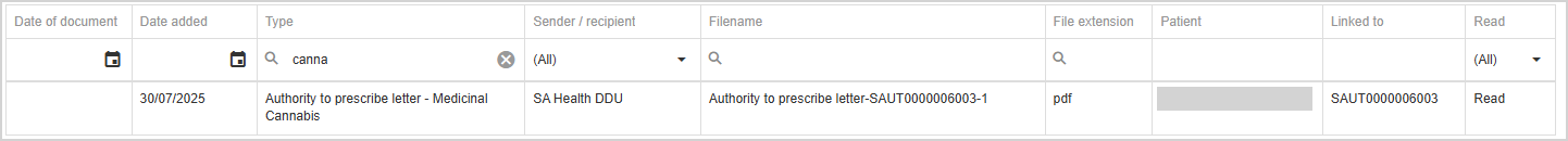 If the correspondence item is linked to an authority, the patient name is shown.