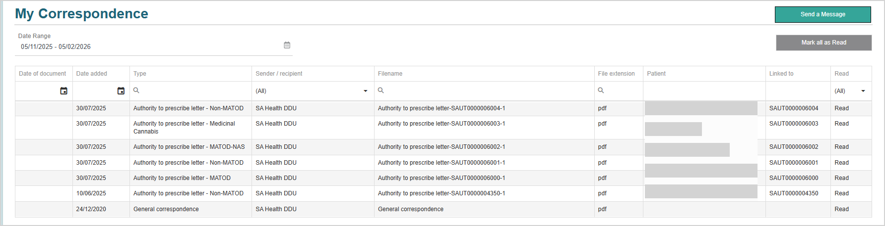 From this page, you can send a new message to DDU, read and download correspondence items, and, where relevant, click through to the related authority or patient.